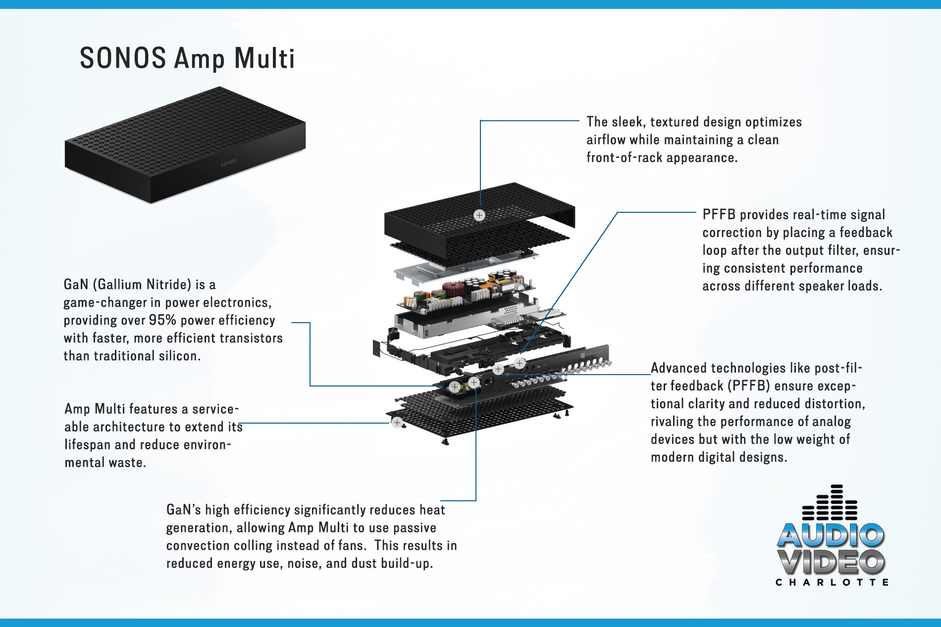 For smaller setups, the standard Amp remains a solid choice. But for larger homes in Charlotte that are wired for multiple zones, this could simplify installs, reduce rack clutter, and make future expansion much easier. If you’re building, renovating, or upgrading your home audio system, it’s worth having a conversation before purchasing anything.